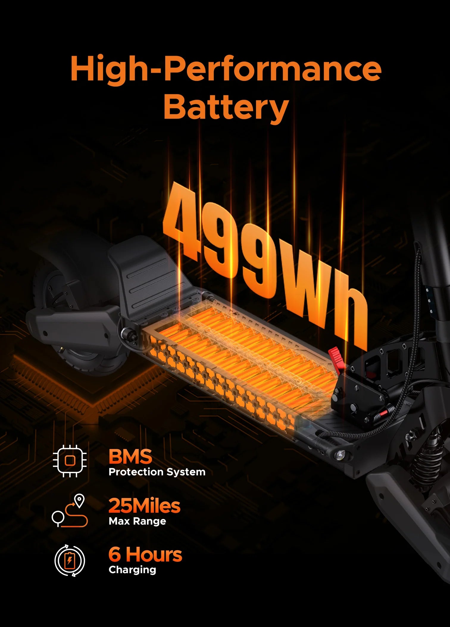 High-Capacity Battery with BMS Protection System ensures longer, safer rides.