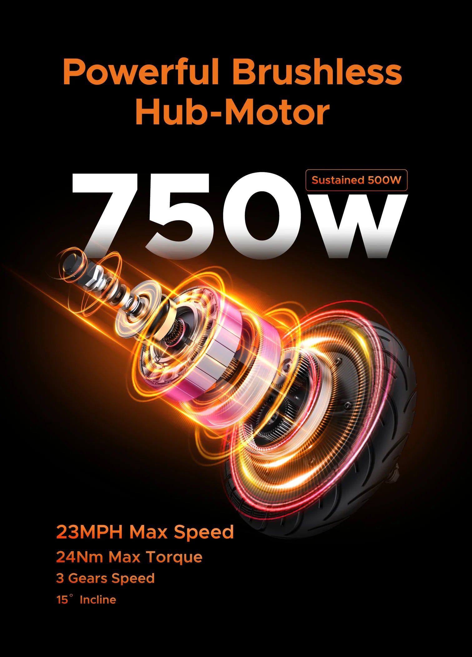 The 750W (Peak) Motor delivers swift acceleration and effortlessly conquers hills.